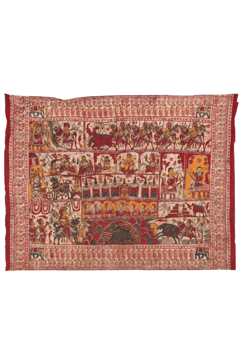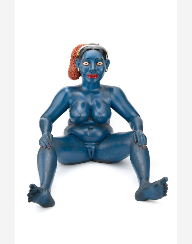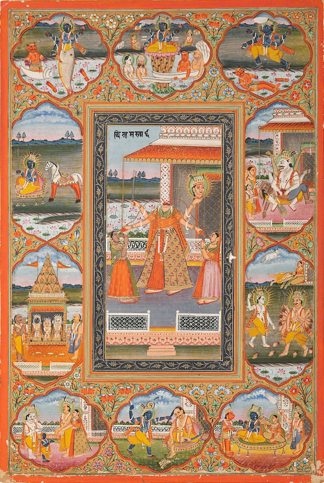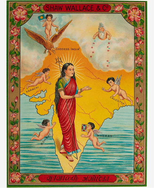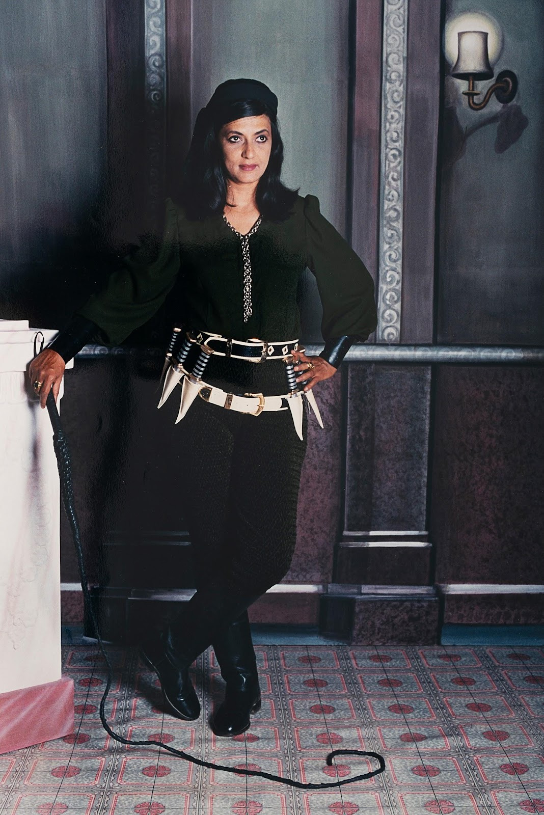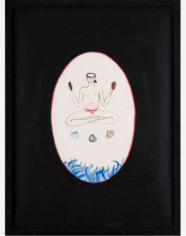 A woman with five arms, stands on a man like goddess Kali or Durga. She holds unexpected/unusual elements/attributes such as a pistol pointing at a man. She is much bigger in size as compared to the man who is floating in the painting. Has the artist imagined a goddess as a mortal woman? Does she unravel a tale of violence and empowerment of women?