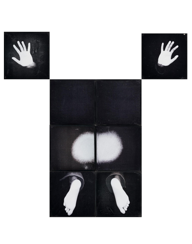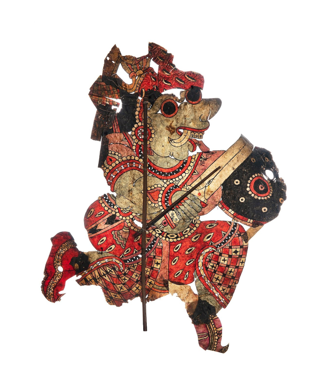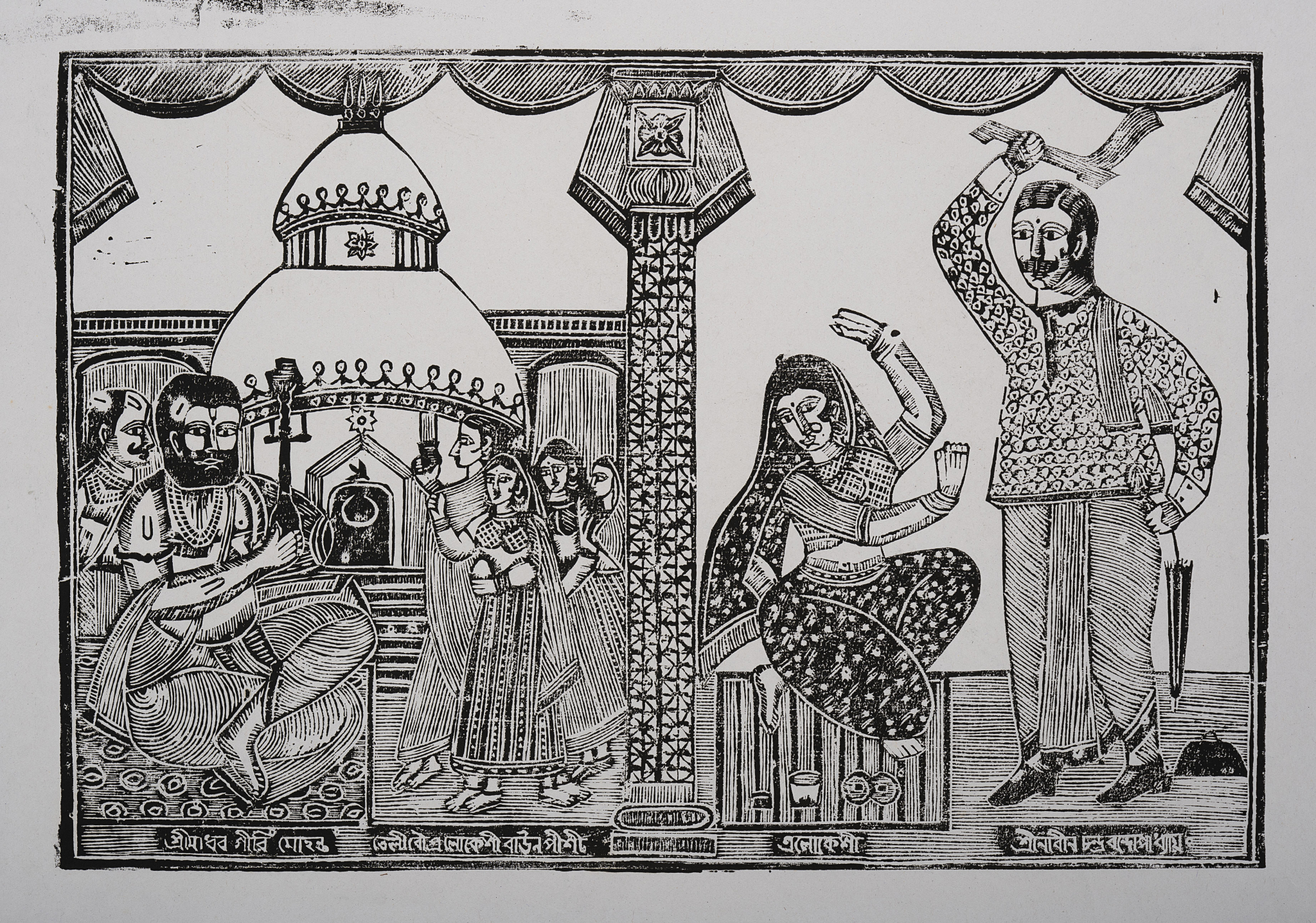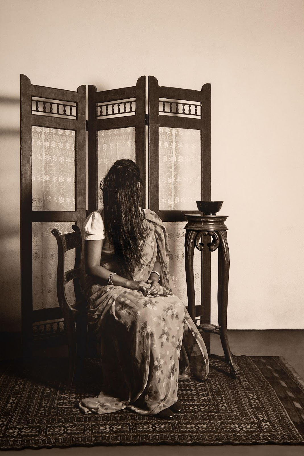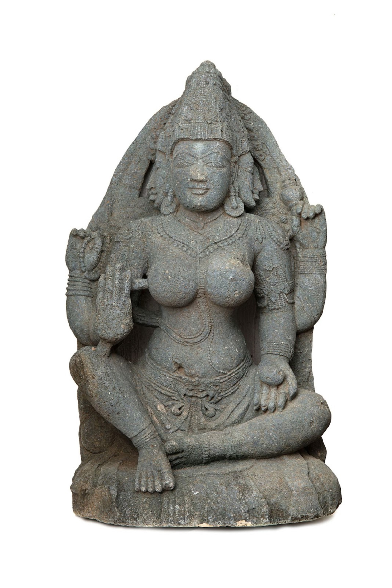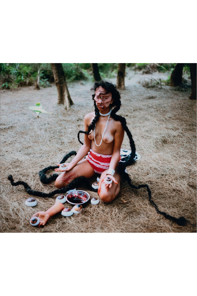 A woman with five arms, stands on a man like goddess Kali or Durga. She holds unexpected/unusual elements/attributes such as a pistol pointing at a man. She is much bigger in size as compared to the man who is floating in the painting. Has the artist imagined a goddess as a mortal woman? Does she unravel a tale of violence and empowerment of women?