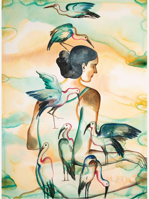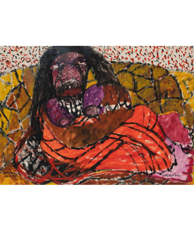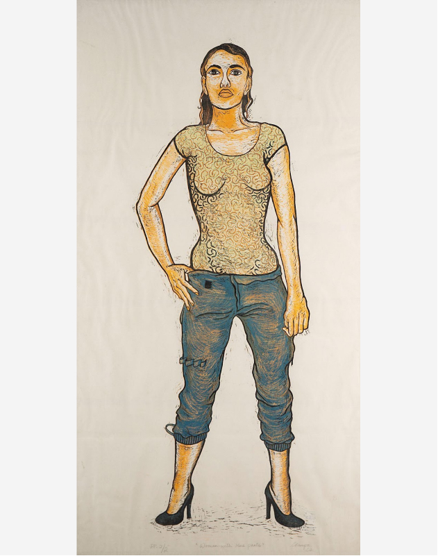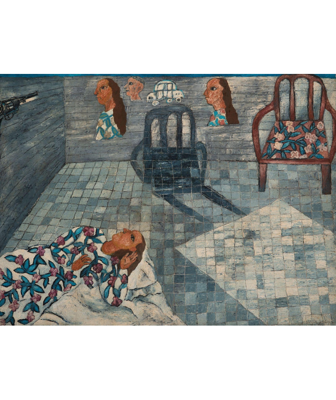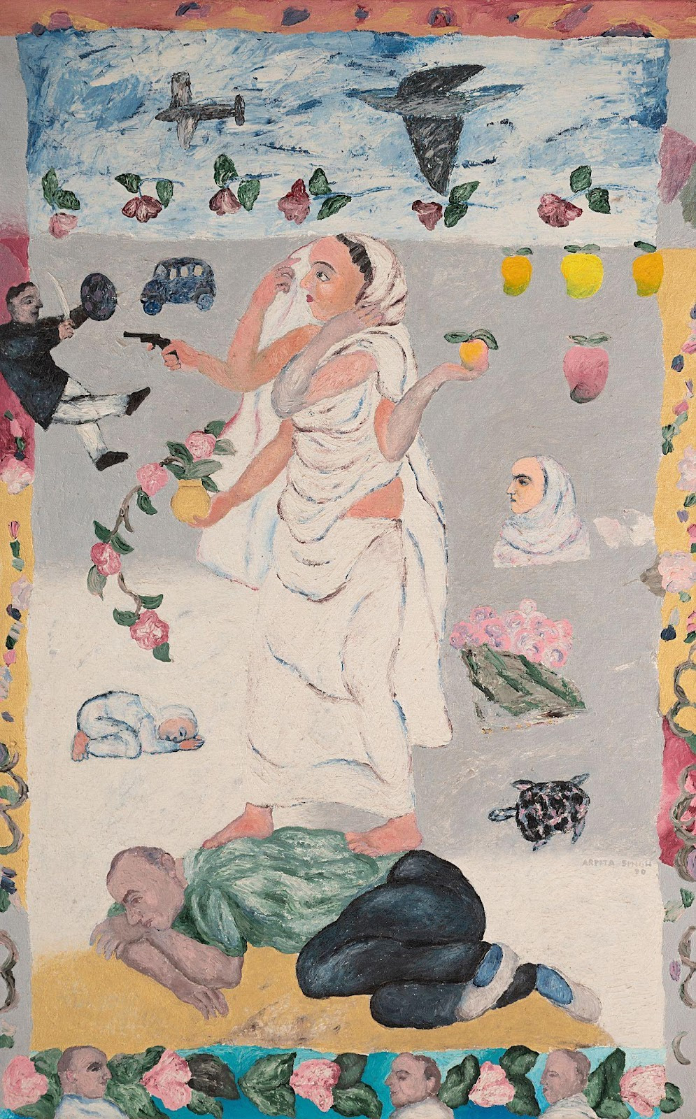Devi pistol Wali by Arpita Singh draws on the iconography of Goddess Durga. Yet, Singh’s reimagining of the goddess raises several questions. Who is this pistol-wielding figure? Why does she wear white, a colour associated with widows? Why has the artist imagined her as a mortal woman?