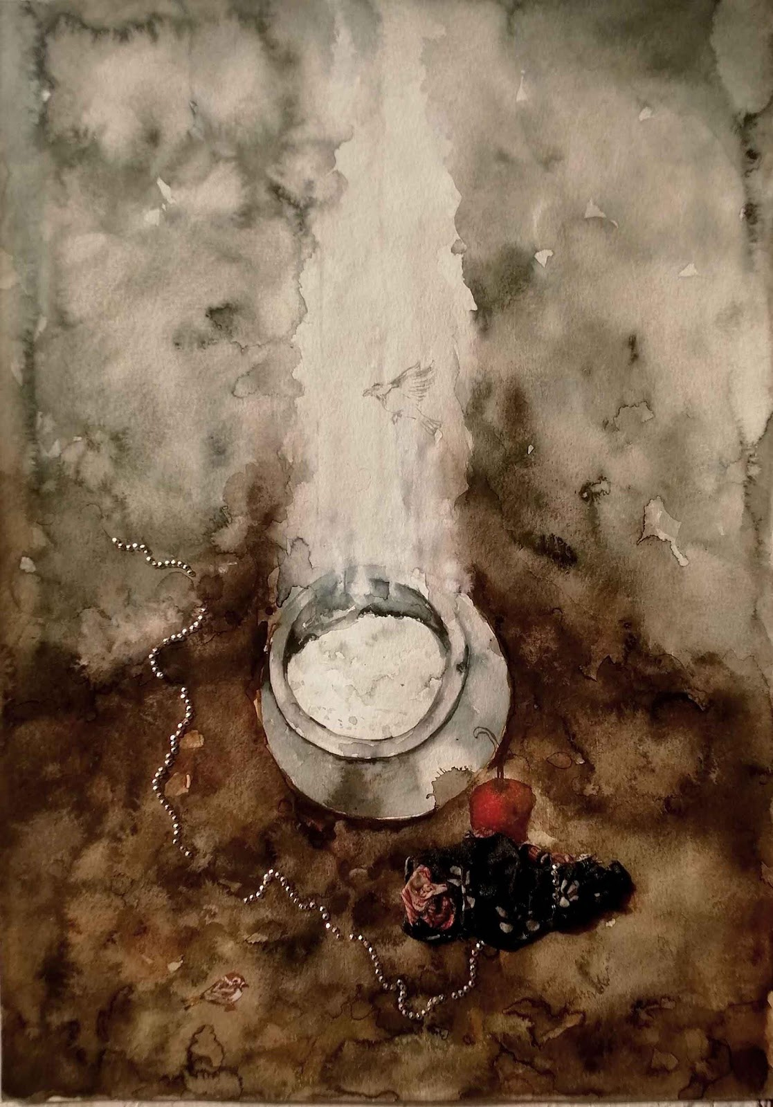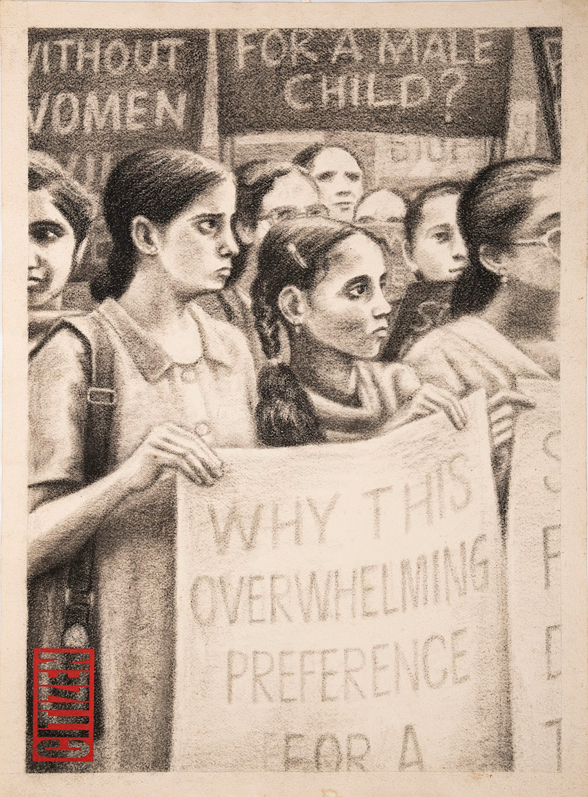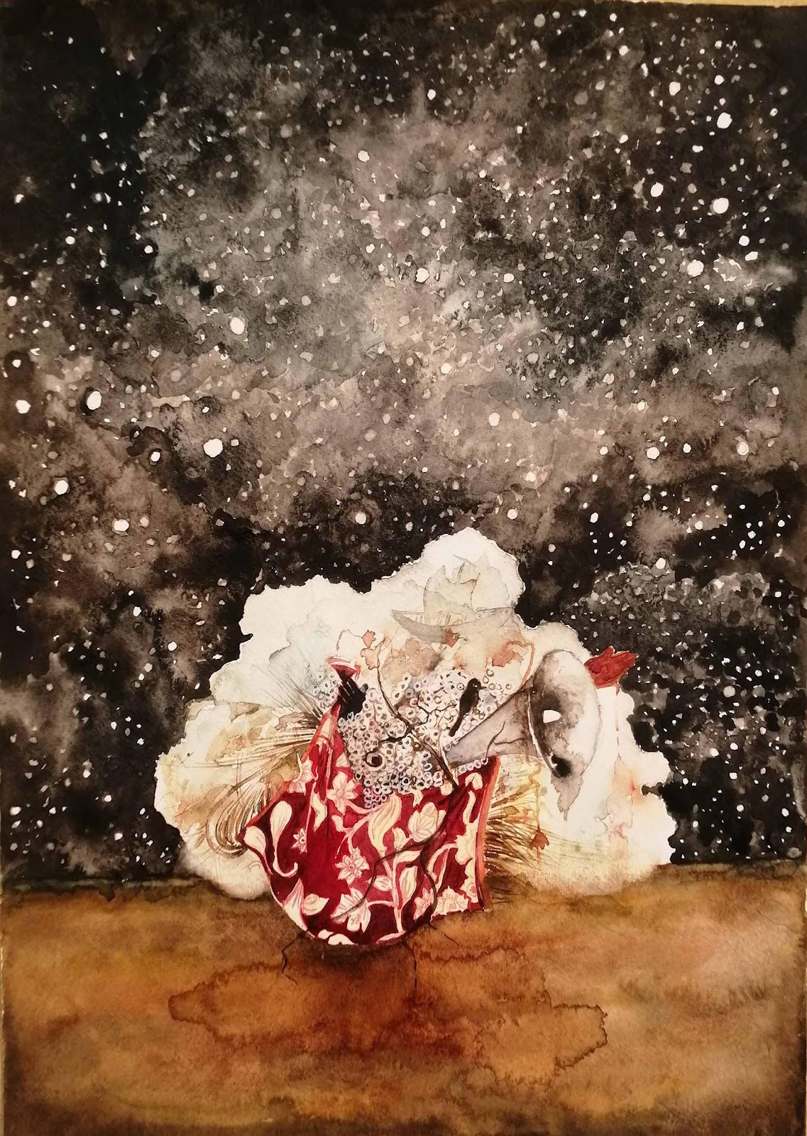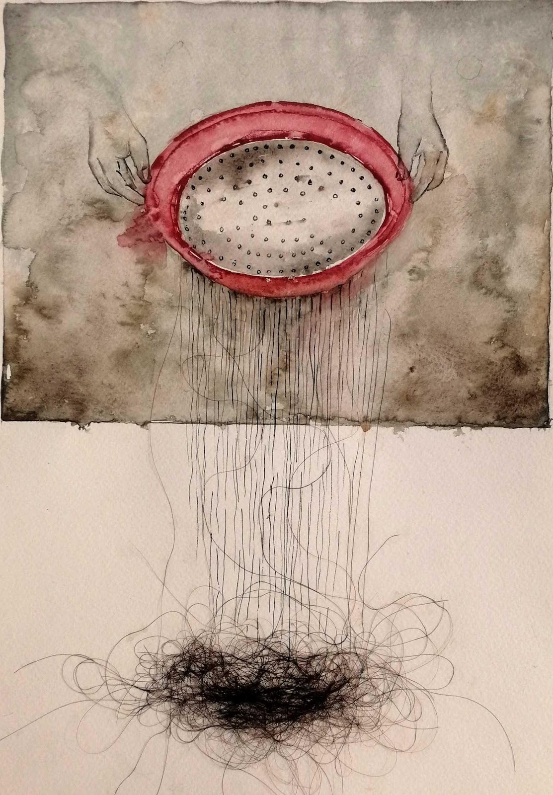 A woman with five arms, stands on a man like goddess Kali or Durga. She holds unexpected/unusual elements/attributes such as a pistol pointing at a man. She is much bigger in size as compared to the man who is floating in the painting. Has the artist imagined a goddess as a mortal woman? Does she unravel a tale of violence and empowerment of women?